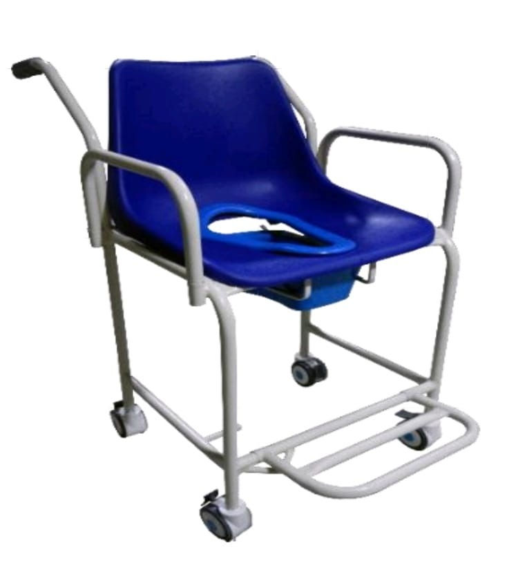 Silla de ruedas estandar economica, con marco en acero, pintado de color negro, tapiceria en nylon, reposa brazos fijo, reposa pies en pasta desmontables, ruedas con radios, llantas macizas